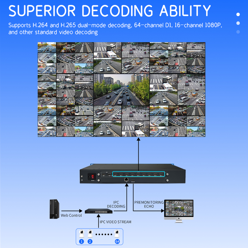 Decodificação de 64xd1@30fps/16x1080p@30fps H.265/1.264 |